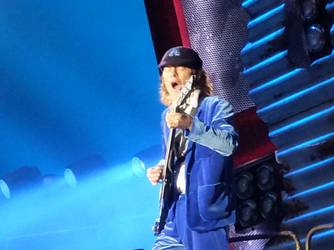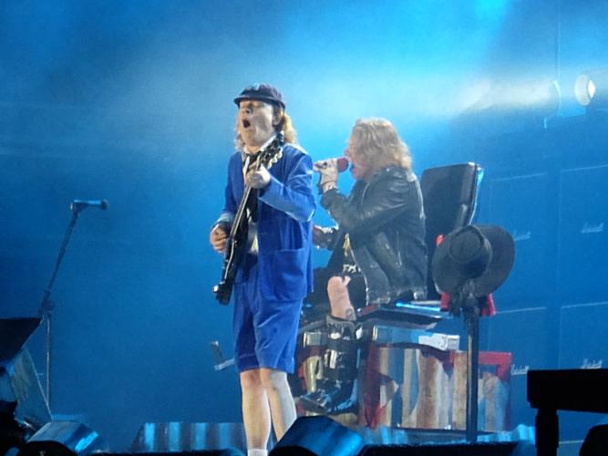 Rock or Bust, et non pas rock or rust (alors que le décor en tôle ondulée commence à rouiller sérieusement) : le son est putain d'énorme à dix mètres de la scène tout devant, où c'est le barnum habituel. Avec un Angus Young définitivement imputrescible, qui duckwalke directement et cabotine à mort dans sa flanelle bleue, les autres rescapés ou nouveaux ou anciens revenus, qui font comme toujours de la figuration flegmatique... Et Axl Rose, toujours blessé au pied, qui arrive bien tanqué sur une chaise roulante, posé sur son bide et sur au moins 4 mentons. Vocalement il n'a pas pris une ride (facialement non plus, merci Dr Botox !), il est de bonne humeur et il s'avère qu'il est parfaitement qualifié pour reprendre la puissante Shoot to Thrill et la toujours huge Hell ain't no bad place to be ...