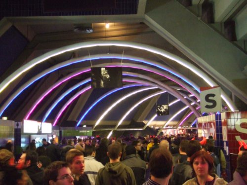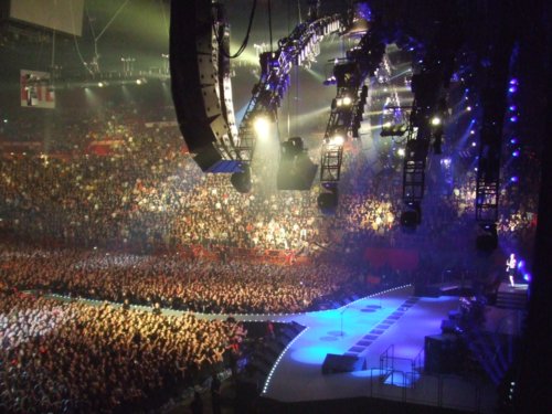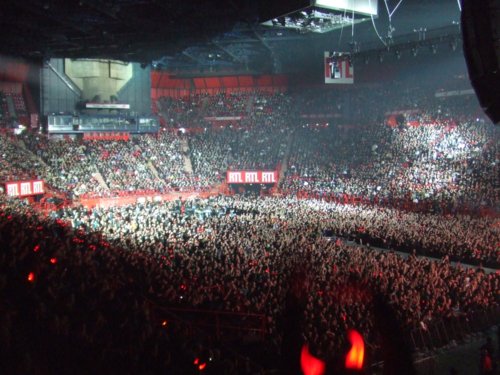 Après avoir comme il se doit et comme tout le monde, éclusé quelque bières-cacahuètes sur le parvis du POPB, on gagne donc l'intérieur, dont le couloir circulaire est à la fois très fonctionnel et particulièrement laid (on se croirait dans Total Recall), et une salle qui ne donne pas l'impression d'être si grande que ça - globalement une réussite architecturale, donc. La salle est toutefois floquée aux couleurs traumatisantes de RTL (et oui, même pas de RTL 2 !), ce qui ouvre de bouleversants abimes sur le sens de la vie et sur l'identité possible du fan lambda d'AC/DC qui, on le réalise soudain, pourrait au fond bien être le même que celui de Johnny...