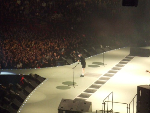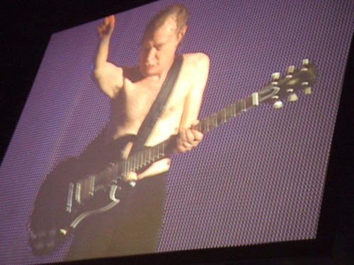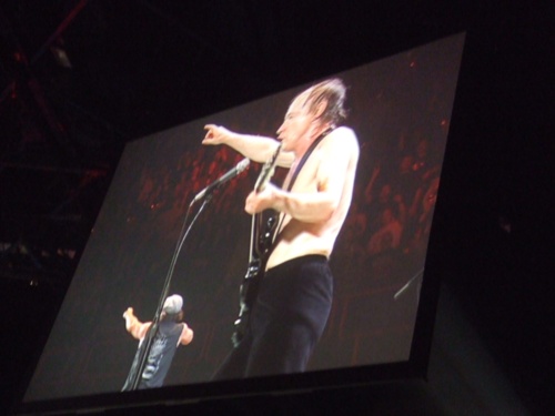 Même vu de côté et de dessus, la scène est si fascinante qu'on oublie pratiquement de regarder l'écran géant juste au dessus de nous - qui révèle pourtant les bien jolis minois en transe de tout le groupe. Même la passable Black Ice donne pas mal du tout sur scène. Sur le blues en béton de The Jack, on s'aperçoit qu'aucun des musiciens n'est branché à quoi que ce soit - ces mecs-là n'ont pas du en voir depuis des années, de jack ! Le père Angus en profite pour faire son strip-tease attendu, jusqu'au caleçon floqué au nom du groupe - sans surprises mais rigolo.