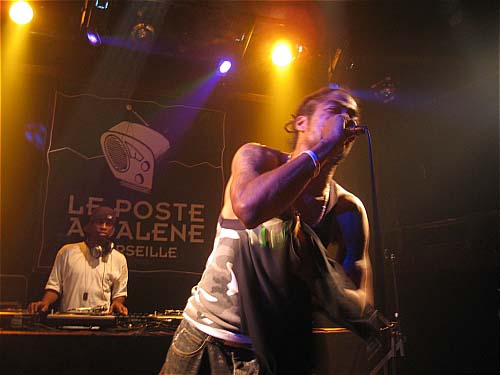 Apres le très bon bout de concert intimiste de L'hurluberlu au Dan Racing, changement d'ambiance radical avec le new yorkais de Afu-ra. Le Poste est plutôt plein et les gens sont excités. Sur scène un grand rappeur avec des longues dreads dans le dos qui harangue le public, épaulé par un DJ