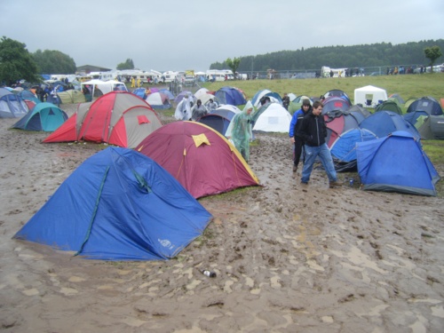 Et au final, heureusement : ce camping officiel, découvert ensuite, a été inexplicablement placé à l'entrée du site, et devait donc être traversé par l'ensemble du public. Le chemin central rapidement bousillé et enbourbé, les gens se sont mis à zigzaguer entre les tentes : au final, l'ensemble de ce camping s'est littéralement transformé en une mer de boue sur laquelle flottaient [dans laquelle s'enfonçaient] des tentes trempées jusqu'aux arceaux : Glastonbury recréé en Suisse ! (photo prise le lendemain). Les malheureux campeurs ont du y vivre, au sens propre, dans la merde pendant toute la durée du Festival, quand nous n'avons vécu que sous l'eau, et sur quelque chose qui ressemblait encore à de l'herbe...