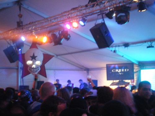 Fin de soirée presque agréable donc, arrosée de bière enfin fraîche et servie dans des magnifiques godets collectors du festival. On a en outre découvert une grande tente (donc, un vrai toit et un vrai plancher, deux denrées précieuses à un point inimaginable sur ce site infernal !) qui faisait boîte de nuit. Et autant dire, la boîte de nuit dont tout metalleux/se rêve depuis son enfance, avec un DJ certifié metalhead aux platines : hommage à Ronnie James Dio, extraits de Rammstein live à Nimes, tubes de Megadeth, Motörhead, RATM, SOAD, etc. etc., en clip ou en disque, plus des saloperies suisses du style, toutes hurlés en karaoke par cinq cent personnes déchaînées, avec buvette à proximité : que du bonheur.