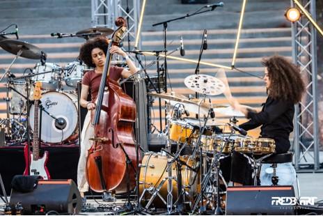 Ils sont calmes, humbles, là pour faire leurs preuves. Rapide discours de bienvenue d'Alfa, et en avant vavavoum. Les visages longs et les mines fermés, il ne faudra que quelques secondes pour que la formation ne laisse aucun doute sur ses capacités. C'est du jazz de haut niveau. Vient un morceau où le chef de clan joue sur son clavier un air mélancolique. La voix de Kaya Thomas-Dyke, la bassiste guerrière, monte sous la voute de la cathédrale sans toit, aux murs d'écorces, du théâtre. La musique se tend, s'amplifie, puis la batterie de Jas Kayser, belle comme une lionne, s'immisce. De ses bras et de ses jambes, déliés sur la terre, elle délie les notes dans les cieux. Enfin, trompette et guitare enfoncent la digue que la fragile complainte bâtissait.