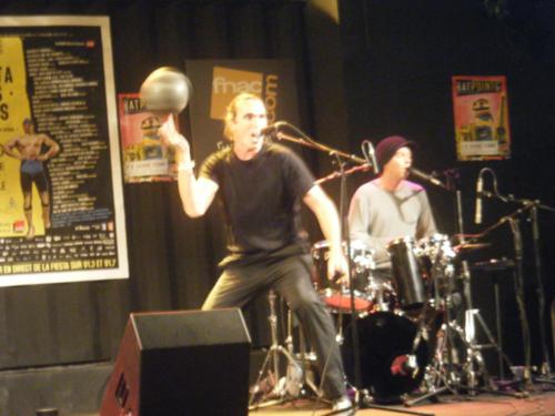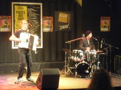 En sortant enfin, on arrive en retard à BATpointG, qui a déjà commencé, le dos contre un conteneur sur une petite scène Fnac assez cheap, et s'emploie pourtant à convaincre un public d'abord fugace que oui, on peut fait du hip hop battle avec juste un accordéon et une batterie (celle de son compère Mr Tchack, trafiquée aux bruits de bouche), et que ce soit supa'cool ! Les deux ex-Grosses Papilles parviennent eux aussi sans difficulté à scotcher la plus grande partie de l'auditoire qui restera finalement tout leur (petit) set, avec leurs tubes en devenir : en tout cas on les reconnait fort bien, plus de six mois après notre première rencontre à la Machine à Coudre !