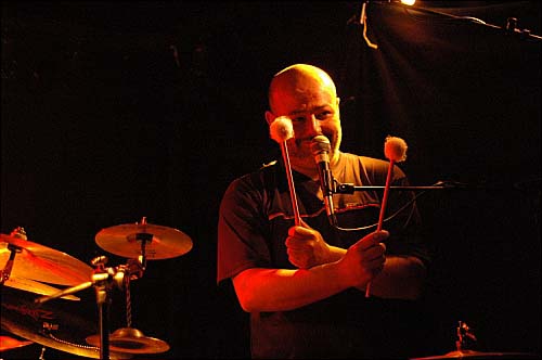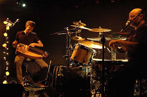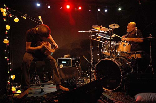Le groupe prend place dans la scène-alcove de l'Exodus. Le longiligne Sébastien Tron avec sa vieille à roue et ses pédales et le plus rondouillet Richard Monségu derrière sa batterie et diverses percussions.
