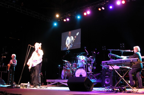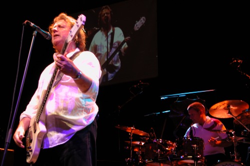 Pour les autres, comme moi, qui ont été plus interpelés par le nom des musiciens, et l'appellation "dream team du rock progressif", il y a eu un enthousiasme plus modéré. Certes, il n'y a rien à redire sur la qualité des musiciens : le passage acoustique de Steve Howe suffit à lui seul à traduire le talent du guitariste; Carl Palmer a été pêchu du début à la fin; John Wetton a assuré un bon chant et un jeu de basse à l'onglet peu commun et lui permettant de placer quelques notes au son slap convainquantes; quant à Geoff Downes...Bien, mais je suis réticent à certains sons de claviers comme le "cor de chasse" et certains parfois trop "datés". Par contre, c'est dans le côté progressif que je n'ai pas trouvé mon compte. Les compositions d'Asia ont sonné, d'une façon générale, plutôt comme du rock-FM, avec des refrains un peu pop, des gimmicks de guitares dans les aigus un peu systématiques, des sons de claviers à la Europe, avec une structure assez classique et de durée courte (pour du rock-progressif j'entends bien). Maintenant, du point de vue de l'interprétation, là non plus rien à dire, c'était nickel. Le groupe a bénéficié d'un son excellent pour chaque instrument (à l'instar des sons acoustique ou de sitar de la guitare posée sur un pied (alternative à la guitare à deux manches) devant Steve Howe) et également d'une excellente balance. Pour agrémenter le spectacle, les projections alternaient vues de la scène avec quelques vieux clips, où l'on retrouvait les musiciens et leur cheveux blonds, et apportaient un côté kitsch (notamment les scènes de The Smile Has Left Your Eyes où l'on voyait des acteurs en 2CV dans Paris) et un côté second degré. En effet, les musiciens ont affiché une attitude décontractée, pas prise de grosse tête, à l'image de Geoff Downes qui a revêtu la tenue des Buggles pour interpréter Video Killed the Radio Star. Le chant au mégaphone, les "hou-hou" de choristes imités à la guitare, refrain en voix synthétique, tout y était mais le côté second degré aurait été plus réussi si le groupe avait arrêté le morceau brusquement en faisant une quelconque remarque plutôt que d'y ajouter un chorus sans fin de Steve Howe. D'ailleurs ce dernier a cultivé un jeu de scène particulier durant le concert , dont je me demande si le comique était toujours voulu : il prend son élan pour courir vers la batterie et fait sa prière sur Without you, il se fait "agresser" par deux confettis, vestiges d'un spectacle antérieur, qui lui tombent dessus comme le dolmen miniature de Stone Age tombait sur la scène des Spinal Tap!