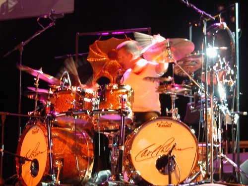 18h05 Les projections du logo bleu d'Asia, sur les deux écrans placés sur le fond de la scène, sont nos seuls guides pour retrouver les premiers rangs. Les quatre membres du groupe arrivent alors devant nous, quatre musiciens composant "la dream team du rock progressif". Cette analogie avec le monde sportif, vient du fait que chacun est issu des plus prestigieux des groupes fondateurs du rock progressifs à savoir Yes, King Crimson, et ELP. Et à ce titre "ils sont" presque le rock progressif, je dirai les 4 fantastiques du genre. Carl Palmer serait L'homme de pierre (La chose): habillé d'un tee-shirt sportswear blanc et rouge, il surplombe sa batterie et affiche un physique sportif et dynamique sur lequel le temps semble avoir eu peu d'effets. Deux grosses caisses, fûts à l'horizontale permettant une vue bien dégagée, multitude de cymbales et deux gongs (un rond, l'autre en forme de bouclier doré dans lequel est moulé une araignée), deux accessoires encombrants sur lesquels n'est généralement porté qu'un seul coup au cours d'un concert, entourent le batteur ne le rendant que plus imposant. John Wetton serait Mr Fantastique : en première ligne, à la fois leader au chant, et soutient rythmique à la basse, il tient la structure musicale des morceaux par les deux bouts. Sa voix s'est un peu épaissie avec les années, mais sa stature devant le micro est restée inchangée, instrument en bandoulière qu'il tient relativement bas et qu'il maîtrise à l'aveugle d'un pouce agile. Steve Howe serait La torche humaine : mais les années passées, il se serait beaucoup (voire complètement) consumé, laissant apparaître le corps frêle de Mr Burns (personnage de la série The Simpons). De deux ans l'aîné de John Wetton, il paraît 20 ans de plus. Chemise à rayures fermée jusqu'au dernier bouton, pantalon gris en tergal marqué d'un pli au fer à repasser, lunettes et cheveux mi-longs blancs autour d'un crâne dégarni, il est presque anti-rock'n'roll! Mais ces considérations physiques passées, la flamme de la guitare qui l'anime est restée, elle, intacte, et c'est finalement tout ce qui importe à ceux qui sont présents aujourd'hui. L'analogie est une méthode qui a souvent montré ses limites et en ce qui concerne Geoff Downes on peut dire qu'il est tout sauf Invisible : il jongle avec pas moins de 8 claviers placés autour de lui, un autre planté devant la scène et un dernier qu'il porte en bandoulière pour venir se coller au dos de John Wetton. Il enfile veste à brillants et lunettes noires pour interpréter son succès personnel.