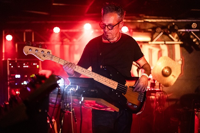 Le bassiste, aux innombrables tatouages, également préposé aux machines, est placé devant la scène. Il s'agite dans tous les sens, part dans des danses extravagantes et capte ainsi l'attention du public. Beaucoup ont remarqué l'énorme guillotine tatouée sur son biceps, du plus bel effet. Il chante sur certains titres à l'unisson avec Franklin J. Fischer et leur deux voix résonnent avec une ferveur digne du meilleur gospel, un gospel punk, pourrait-on dire.