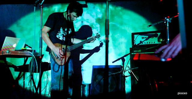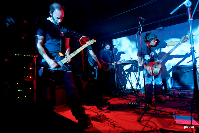 Overmars débarque sur scène. Enfin, il leur faut du temps, vu qu'ils sont six et qu'il y a du matos. Deux grattes, deux machines (dont un jonglant avec une troisième gratte), un bassiste, un batteur et des projections. Le groupe écume, sous divers lineup, la galaxie bruitiste depuis une décennie, et je reconnaîtrais quelques gueules aperçues ailleurs dont le bassiste (de mes chouchous Kabbu Ki Buddha) et le grand gratteux (Binaire). Je ne suis pas assez cultivationné pour choper le pédigrée de tout le monde, mais c'est pas des débutants.