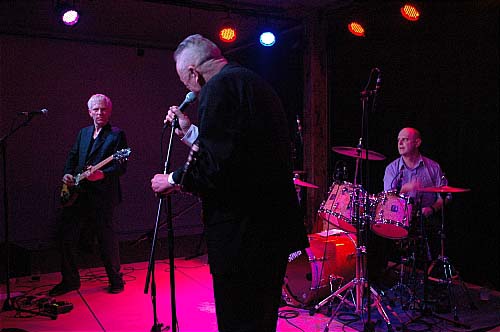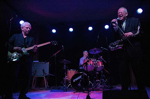 Les trois musiciens prennent alors place sur scène. Il s'agit d'un trio composé de Ted Milton au saxophone, aux grimaces et au chant, de Steve Eagles a la guitare et Bob Leithz a la batterie. C'est clairement Ted Milton qui assure le spectacle, ne serait ce que physiquement. Cette coupe de cheveux, ce regard halluciné, ces grimaces (je me répète), ...