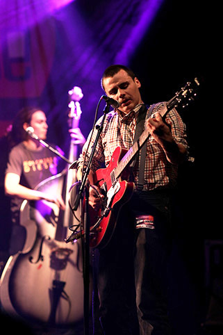 En attendant ce grand moment, place à l'essentiel : le Rock ‘n Roll. Celui des Barbed Wire Brothers - programmé en première partie ce soir - est mélangé avec une bonne dose de Country folk blues et fleure bon le Kentucky. Sur le site myspace du groupe, on apprend avec joie qu'il est influencé par Johnny Cash, Jack Daniel's, Heavy Trash, Mösbraü, Against Me!, Pascal Brunner, Elvis, Negrita... Le combo, joliment branquignole et déjà auteur d'excellents concerts à l'arrache partout dans les environs, semble un peu timide et mou sur la scène du Club de la Coopé au début de sa prestation... Les excellents morceaux de la troupe composée du chanteur de Stetson (au micro et au banjo), de deux éminents membres d'Araban (batterie, guitare électrique ou banjo), de Billy du Bikini (guitare, voix) et d'un contrebassiste pas maladroit, sonnent paradoxalement de manière moins percutante qu'en plein air, totalement débranché. La pression sans doute...