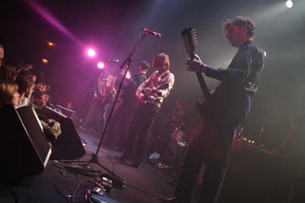 Le concert a duré deux heures et quart d'où on peut retrancher au moins une demi-heure de parlottes entre les morceaux. Les musiciens étaient affûtés prêts à enchaîner le tout de manière professionnelle, mais Anton Newcombe se comportait en vrai chieur molasson. Planqué sur la gauche de la scène, il a joué les premiers morceaux appuyé contre le mur avec sur les épaules une immonde parka au col en fourrure. La setlist s'improvisait au fur et à mesure suivant la fantaisie du leader, ses compagnons le guettant de l'il pour éviter de se tromper. Vu son caractère violent et ombrageux vaut mieux filer droit. A un moment, l'un des guitaristes s'est pris une volée d'insultes, on ne sait trop pourquoi, lui non plus, qui jusqu'à la fin s'est demandé ce qu'il avait pu faire de mal. Plus tard, Anton demanda au bassiste de venir raconter une blague au public. Il s'exécuta, mais en allemand. Nous protestâmes, pensant que pris dans le tourbillon de leur tournée mondiale, ils ne savaient plus où ils étaient. Et le bassiste de nous expliquer que cela faisait partie du défi que lui avait lancé son patron: dire une blague en allemand. Anton nous gratifia lui-même de quelques paroles, à propos du mariage de Tom Cruise, de la télévision, concluant le tout d'un philosophique : let's be happy today because tomorrow may be worse.