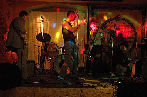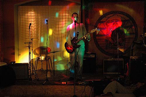 Verdict : toujours aussi delirants, les 5 Ecran Total, de gauche a droite guitariste, batteur (en fait c'est lui Robby), chanteur, bassistE et guitariste/flutiste/pianiste, font une musique assez difficile a decrire avec des mots. La lumiere du lieu ce soir convenait tout a fait a leur univers ...