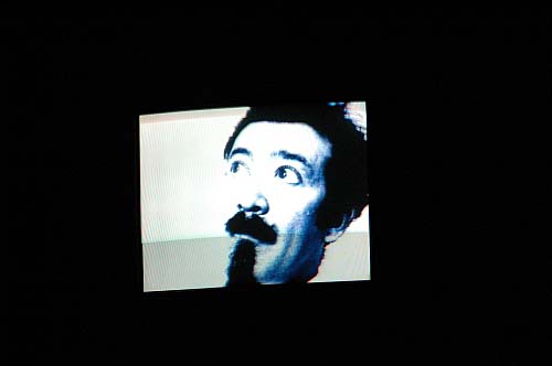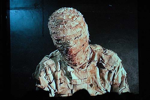 Bon, c'est sûr, la démonstration scientifique, les extraits de films, les interventions débiles des conférenciers présents, tout est hallucinant, et la salle se fend la poire à intervalles réguliers face à l'absurdité de la séance... Mais les monstres, on les verra que sur écran géant ? On croise les jambes, on se concentre, on commence vaguement à s'assoupir un peu comme on le ferait dans une "vraie" conférence, un sourire bête collé aux lèvres, et alors que l'attention se relâche, BLAM! : sur l'écran 4x3, le Cap'tain Carnasse vient d'apparaître comme un obus, flaquant un énorme coup de sabre dans la nuque de la Momie qui était en plein "témoignage en duplex" : en quelques secondes, tout bascule : on prend des flashes plein la tête, y'a du bruit, tout est plongé dans le noir, la télé déraille, les conférenciers crient, et dans un médaillon de lumière giclant sur le rideau rouge encore fermé, Carnasse, le vrai, en chair et en os, montre sa figure ensanglantée.