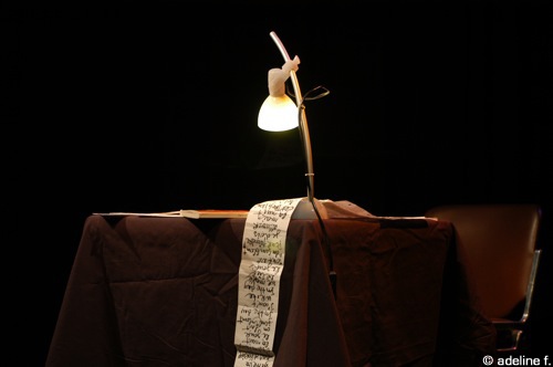 Un petit quart d'heure de mise en situation, et les projecteurs font enfin leur apparition, dévoilant pour décor une chaise et un bureau, sur lequel est déposé un tas de lettres.