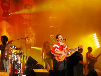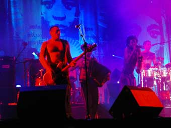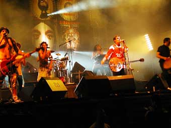 Sur un fond de reggae rock il a enchaîné morceaux de ces deux albums solos et nouveau morceaux plus vers la fin des morceaux de la Mano Negra. Le public était tout aussi déchaîné sur ces dernières que sur les premières. Des pogos sans trop d'agressivité (en tout cas dans mon coin). En dehors de un ou deux qui n'étaient plus maîtres de eux même ou très cons, le pogo était plutôt gentil et limité à un cercle assez précis. Pas trop de mouvement latéraux ni de slams juste ce qu'il faut. Du coup on été pas trop écrasé ni trop bousculé si on ne le voulait pas. Sur scène Manu Chao avec son haut de maillot rouge ne cessait de gesticuler, la tête en arrière, l'air vraiment ravi.
