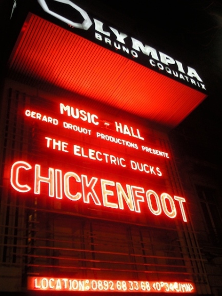 L'Olympia était bien rempli, mais pas complet, pour ce concert exceptionnel du super-groupe Chickenfoot ; la faute, peut-être, à des billets un peu chers (de 60 à 70€). Il faut dire que le line-up justifie de mettre la main au porte-monnaie, puisque Chickenfoot, c'est rien de moins que le guitariste virtuose Joe Satriani (souvent considéré comme un des tous meilleurs au monde), entouré de Sammy Haggar, ancien chanteur de Van Halen, Michael Anthony, ancien bassiste du même groupe, et Chad Smith, batteur des Red Hot Chili Peppers (ce dernier ayant quitté le groupe l'été dernier pour se consacrer au nouvel album et à la tournée des Peppers). Un "super-groupe", donc, dont les apparitions sont rares en France et dont la venue en ce mois de janvier était un des évènements musicaux du début d'année.