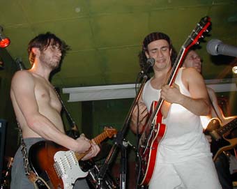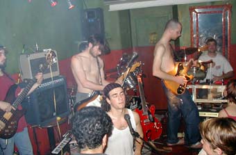 L'intermédiaire était toujours aussi plein (comme tous les samedi et vendredi) et c'est avec difficultés que je me suis frayé un chemin dans un public très dense et dans une chaleur abominable ... D'ailleurs sur scène ils avaient presque tous enlevé leur T shirt. Au début j'avais un peu de mal à comprendre ... je voyais 2 guitaristes, un bassiste, un batteur et un percussionniste sans micro, pourtant j'entendais des paroles. En m'approchant j'ai découvert le chanteur au look d'Hidalgo au synthé assis sur le bord de la scène.
