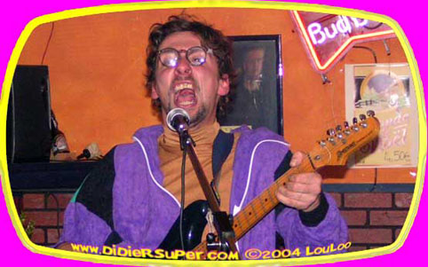 La place est maintenant libre pour le chanteur que tout le monde attend, le "fameux" Didier Super. Dès son arrivée, il triomphe et cabotine, à la grande joie de l'assistance hystérique et pliée en deux à la moindre de ses facéties. Il faut avouer que cet hurluberlu a des talents d'acteur peu communs : on a l'impression d'assister à un spectacle de théâtre de rue, parfois drôle, souvent lourdingue, en tous cas assez épicé. Il semble quand même y avoir une erreur de casting, pourquoi avoir programmé ce rigolo en tête d'affiche d'une soirée "chanson pop en français" ? Certes Didier Super utilise la même langue mais d'une tout autre façon, cela va sans dire... Blagues à deux balles, provocations faciles, ressorts comiques usés jusqu'à la corde, rien n'est épargné au public, qui en redemande bien évidement. Il faut dire que devant cette déferlante de conneries ininterrompues, on ne peut s'empêcher de rire, même en grinçant des dents devant les allusions pachydermiques à la pédophilie, au viol, au racisme, à l'homophobie et à la misère. Même s'il est secondé par une contrebassiste souffre douleur et un idiot du village à la flûte, à la pédale de distorsion et à la grosse caisse (sur la tête), nous assistons donc à un "one man show" de Didier Super. Celui-ci se faisant fort de démontrer à quel point il chante mal, joue - mal - de la guitare et écrit... mal. L'album de Didier Super - plutôt drôle à la première écoute, mais on n'a pas tenté l'expérience une seconde fois... - s'intitule Vaut mieux en rire que s'en foutre (disponible chez tous les disquaires qui ont des couilles, dixit son site Internet), la bonne attitude à adopter semble être de s'en foutre en riant... jaune.