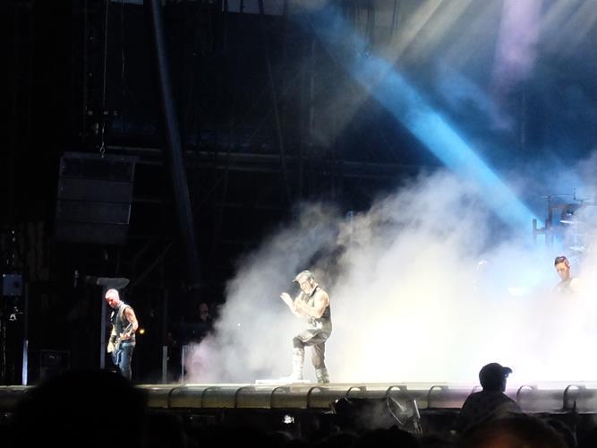 On va vite se placer pour Rammstein, sur la plate-forme pour personne à mobilité réduite, comme on dit chez les langues de bois. La position, bien qu'un peu éloignée, nous offre une vue parfaite, dans un axe diagonal, sur la scène, recouverte d'un immense rideau frappé des armoiries du groupe. A 21h59 précise, un compte à rebours se déclenche sur les écrans géants : 60, 59, 58... Jusqu'au 3, 2, 1, BOUM ! Qui lance le début du show avec d'impressionnants feux d'artifice rouges. On comprend tout de suite pourquoi chaque musicien du groupe possède son diplôme d'artificier, quand la folie pyrotechnique se déchaine : lances flamme, roues de feu, acier en fusion et tir de roquettes se succèdent au fil des tubes.