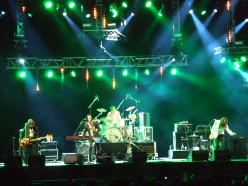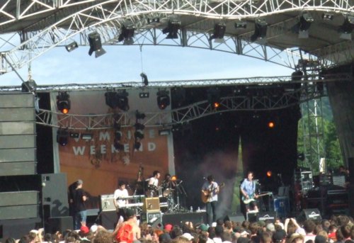 Après ce moment très intense, on confesse un peu de désinvolture pour l'écoute des ludiques Vampire Weekend : il fait baud et cheau (contrepèterie, hum) sur la plage, où un magnifique bar spécial cidre a été installé - même si mon bracelet vert ne donne hélas pas accès à l'étage ... C'est donc en sirotant une boisson à la pomme qu'on écoute de loin les titres eux aussi rafraîchissants du prometteur groupe de New York : des hits sautillants comme A-Punk, Walcott, aux afroïdes Cape Cod Kwassa, Bryn, en passant par de jolies compos pop comme Oxford Comma, M 79 ou Campus, à peu près tout leur premier album y passe, plus quelques inconnus d'avant, ou d'après. C'est quand même nettement moins gonflant dans le style sensation-new-yorkaise-du-moment que les Clap Your Hands say Yeah... juste dommage qu'ils jouent les flutes au synthétiseur et que tout ça sonne exactement comme sur album : très bien donc, mais sans surprise.