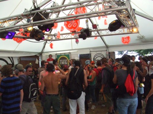 On s'éloigne sur la délicieusement énervante Blake's got a new Face, et quelqu'un (moi) décrète que c'est le moment d'aller tester la Silent Disco, concept très à la mode et franchement rigolo : dans un enclos, tout le monde écoute la même musique au casque, ça gigote furieusement à l'intérieur mais c'est silencieux de dehors, sauf quand l'assistance braille un refrain en choeur en levant les bras. Le DJ, un anglais charmant, a la bonne idée de passer System of a Down au moment précis où l'on reçoit nos casques ; nous sommes donc instantanément séduits par le concept et il s'ensuit un joyeux concours de air guitar / headbang ! Tard dans la nuit, la même attraction dégueulera littéralement de monde - c'était en effet le moment de la tester ! Ca s'achète où au fait cette installation, que je l'offre à mes voisins d'en face ?
