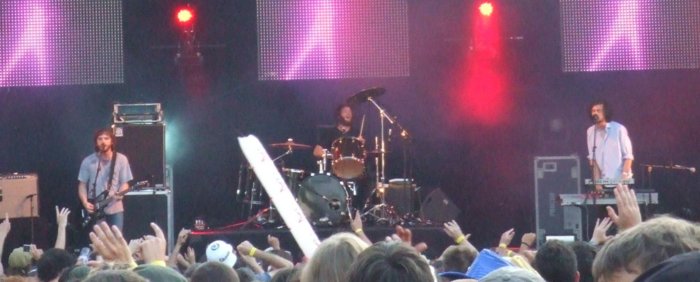 Rien ne nous a pourtant préparé au choc qui va suivre, encore une première en France. Mis à part le fait qu'on adore violemment leur disque (avec le recul, sans doute le meilleur album rock de l'année 2007), et que ce groupe contient de vrais morceaux des Bad Seeds, très bons sur scène il y a peu, ainsi que la totalité de Nick Cave dedans : Grinderman est le groupe dont on attend le plus cette année ! Bien entendu, une bonne partie du public ne sait pas de quoi il s'agit et tant mieux, on peut donc s'en approcher sans problèmes sur la grande scène. Le groupe ayant démarré à toute berzingue, on aime déjà : le son grincheux, rapeux, groovy, et grave vénère de Get It On confirme que tout ceci va être énorme.