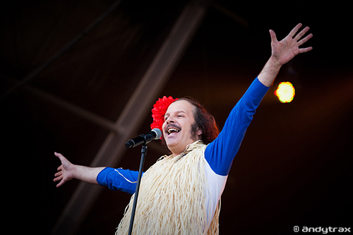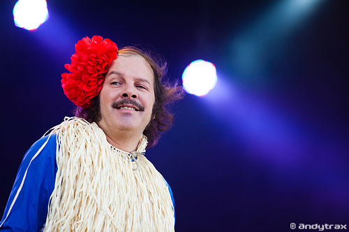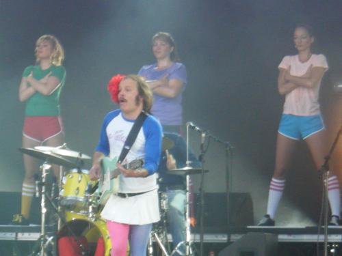 ... Se moquer de ces putains de Téléphones, ou encore déclarer son amour pour nos Fesses, tandis que la scène se remplit de fesseurs, de fesseuses et de fessé(e)s - bien sûr il est aux premières loges, avec sa mini-jupe atroce ! Fin de la séquence sur la toujours très percutante 100 % V.I.P., qui déclenche une belle folie sur le gazon : il faut reconnaître que le bonhomme s'y entend pour soulever une armée !Bien évidemment il n'est pas avare de conneries entre les morceaux, systématiquement percutantes et drôles, comme lorsqu'il suggère gentiment à 4 personnes intégralement couvertes de Lycra (Spandex, le déguisement tendance en 2011 !), de "renoncer à Satan"...