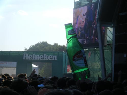 A propos d'alcool, signalons le plus beau geste militant de ces Eurockéennes (initié par de vaillants alsaciens, à n'en pas douter) : introduire et faire circuler une magnifique bouteille de Kronenbourg gonflable, incarnant à merveille la résistance à l'envahisseur Heineken, qui a racheté puis fermé toutes les brasseries d'Alsace... Et dont nous avons subi la déco siglée et l'urine de vache tout le week-end, nostalgiques de la bière alsacienne qui s'affichait bien plus modestement ici... C'est dit !