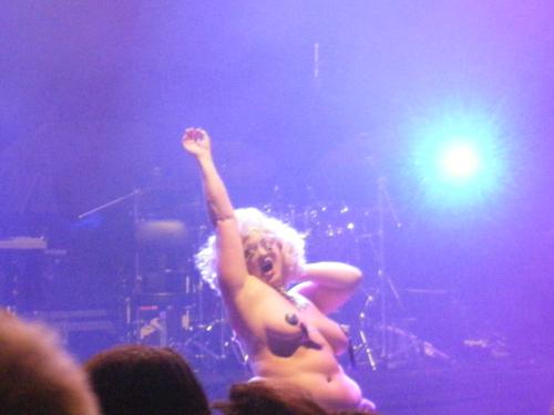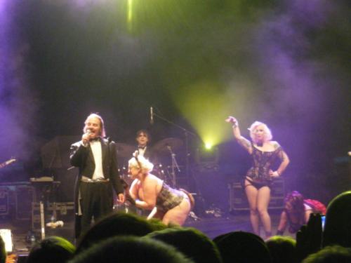 Banana Split (moyenne), Elle est d'ailleurs (très drôle), Capri c'est fini (proprement massacrée), Partir un jour (version jazzy), Confidence pour Confidence, etc, etc... Frôlé par l'ennui, on songe qu'il est trop tard pour aller voir Arcade Fire... Mais heureusement le New Burlesque revient : strip-tease "Kentucky Fried Chicken" pour le mâle (avec lancer final d'aile de poulet dans le public, sortie d'où vous pouvez l'imaginer), puis encore une ou deux reprises stupides mais agrémentées des filles sur scène (Mimi en guèpière et culotte noire, waouuuuuh !) : Mercedes Benz, par exemple...