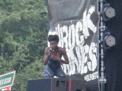 De toutes façons, pas moyen de résister bien longtemps sur scène aux mimiques, poses lascives prises par la créature Shingai Shoniwa, moulée dans une combinaison noire pailletée (notre bombe atomique n°1 de la journée), ramassée comme une tigresse sur les baffles latérales ou alanguie sur la batterie, et à sa très jolie voix sexy - disons que ça parle à l'animal en nous ! Les deux garçons qui l'accompagnent ont d'ailleurs bien du mérite à ne pas perdre le fil, tout comme le public puisque la belle va le gratifier d'une gracieuse petite croisière en crowd-surf, tout en continuant à chanter s'il-vous-plaît ! Au final, le cocktail rock n'soul s'avère chaud et sensuel à défaut d'être très original - le groupe aurait avantageusement pu jouer sur une plus grande scène...