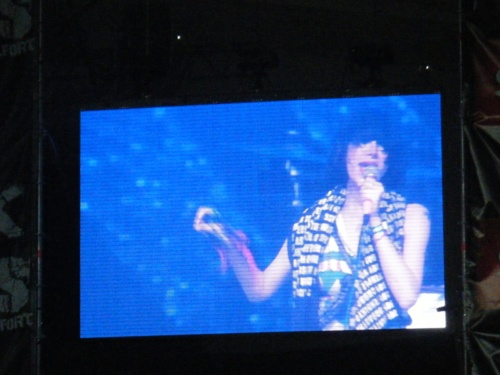 On s'échappera avant la fin, non sans une certaine mufflerie, car c'est le moment d'un de nos rendez-vous majeurs, les Yeah Yeah Yeahs, trio de power rock putassier à en crever emmené par la grande et haute en couleurs Karen O ! Le gang surmonté d'un énorme oeil inquisiteur, attaque pour nous par la percutante Rich, sur un son positivement énorme (comme souvent sous le chapiteau) puis par la chouette Dull Life au final pétaradant. Si la grande jeune fille déguingandée n'a pas un physique aussi torride que la précédente (voire même, un faux air de Marylin Manson coiffé en Mireille Mathieu...), elle le compense par une voix chaude comme de la braise fumante, et une magnifique attitude rock-n-roll, on la décrètera donc bombe atomique n° 2.
