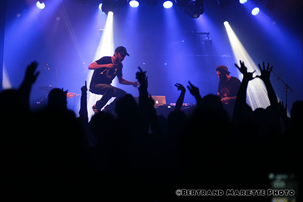 Lorsque Senbeï attrape la gratte, Al'tarba se met à mixer. Ils n'ont pas de rôle fixe, bien défini, chacun joue en complémentarité de l'autre. Je ne vous parle même pas des lumières qui nous plongent dans un univers bien particulier. Enfin ce n'est pas UN univers, mais une MULTITUDE d'univers avec ces deux comparses. Un voyage musical aux influences américaines, asiatiques, britanniques. C2C vous connaissez probablement ! Ici c'est ça, en plus lourd. Ninja tunes aussi tout pareil ! Oh my god, je ne sais plus où promener mes oreilles. Il y a de tout. C'est un panel d'influences musicales tellement vaste, et exécuté avec une telle justesse que j'en reste scotchée. Je le redis, il y a de tout. Du rock, avec une mélodie des Doors, du trip-hop à la Ezekiel, du Prodigy, Chemical Brothers, mais aussi du punk, du métal. Le dub vient se marier à la trap music pour ensuite aller flirter avec du hip-hop énervé. Les sueurs se mélange comme l'affirme Sensbeï ; on n'arrête plus la foule, ni les 2 héros de ce soir qui sont inépuisables. Ils enchaînent leurs titres, leurs présentations sans pause, toujours en interagissant avec les noctambules.