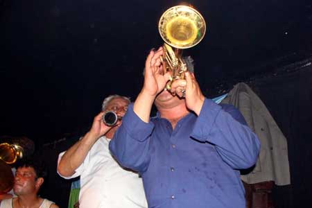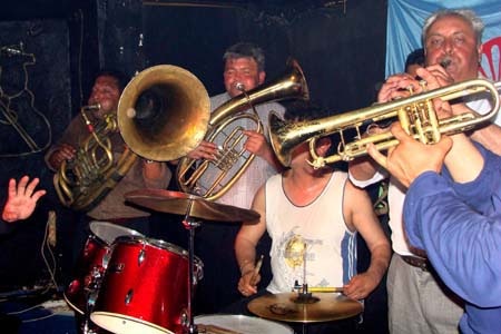 7 cuivres sur scènes, un tuba énorme, des trompettes en folie, un batteur, ne manquait que des poules et Emir Kusturica à ce concert! Pom Pom Pom Pom Pom popopopopoPom!Whouf! Pas besoin d'ingé son ce soir! que du souffle et la sueur des danseurs!!Parce que pour le coup, ils ont mis le feu à la Machine nos moldavo-punk! D'une moyenne d'age de 55 ans, avec des poumons en titane, ils nous ont embarqué dans leurs contrées éloignées pour 2h30 de concert au moins.