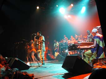 Peu après, Femi Kuti fait son apparition sur scène et je sens la musique africaine me pénétrer par tous les pores. Les cuivres sont magnifiques, le guitariste wahwahise sobrement, le bassiste tient sa ligne sans en rajouter, les claviers sonnent bien roots, les deux percussionnistes apportent une touche encore plus africaine, les choristes sont torrides et Femi chante divinement. La classe ! Non content d'être doué pour la composition et l'interprétation, il est beau comme un dieu et possède des tablettes de chocolat dignes d'un Lion Indomptable camerounais.
