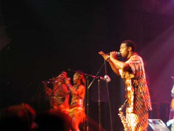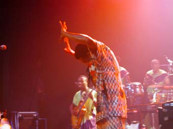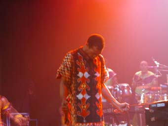 Femi Kuti quant à lui n'arrête pas une minute : quand il ne joue pas du saxo, il saute, tourne, s'accroupit, s'avance vers la foule... en fait j'ai été assez surpris car je m'attendait à un truc rythmé mais plus calme. Le peu de paroles que j'ai pu comprendre genre "cover your bamboo" "don't come too fast" etc ... accompagnés de mimes assez explicites parlent de sexe. Ca m'a donné rappelé un certain Franky Vincent en plus "classe". Une chanson pour lutter contre le Sida (dont est extraite la première citation ci dessus), une autre où il explique (très concentré) qu'il pleure tous les jours en musique comme ça (avec son saxo) pour l'Afrique (which is going down eveyday) et pendant ce temps le guitariste ne cesse de courir après les danseuses.