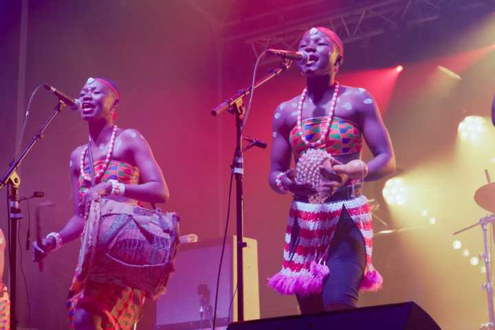 Elles sont une demi douzaine avec 3 chanteuses mises en avant qui sont également musiciennes (aux percussions surtout) et danseuses, avec des chorégraphies et mouvement assez spectaculaires, comme sur ce titre où la bassiste joue avec son instrument au dessus de la tête.