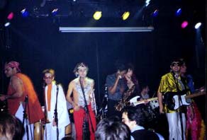 Ils sont 1, 2, 3, ... 7 ou 8, en tout cas un bon paquet, et partagent indéniablement le sens de la fête de la famille Tootaphon. Ils ont du jouer une bonne heure (ils ont commencé vers 22h). Leur style ou plutôt leurs styles sont assez diverses. Du funk oui, mais aussi du rock festif à la Kanjar'oc, beaucoup de cuivres, de percus .. à ce sujet le percussionniste est un véritable fou ! il faut le voir communier avec ses instruments que ce soir en arrière de la scène ou assis sur le bord de la scène avec son énorme "djumbé", sa tête part dans tous les sens avec de ces grimaces ... très sympa à voir tout en gigotant ! Il y a aussi du rap avec un morceau à la gloire de Grenoble où j'ai pu les entendre citer Virago !!! en plus de Sinsemilia. Un morceau chanté par le percussionniste et le guitariste en jupe de fourrure et énorme chapeau léopard (pour cela il y a encore un point commun avec Tootaphon) qui montre toute la maturité du groupe. Sinon tout le monde chante un peu (la fille du groupe surtout), il y a des solos dans tous les sens : saxo, percus, guitare ... Je n'ai pas vu tout le concert, mais tout ce que j'ai vu était très entraînant et abouti, ils ont réussi à chauffer le public et à le faire danser ! Un groupe à suivre ... Il parait qu'ils ont un site internet et un disque je crois...