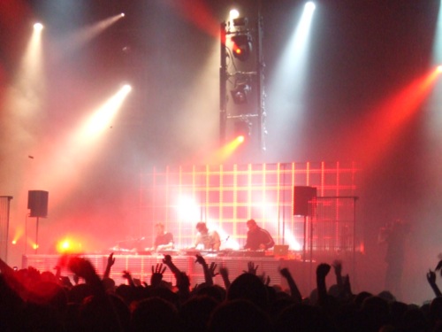 Justice qui doit décidément nous préparer un nouveau disque puissant puisqu'ils envoient alors un truc que mes notes qualifient de "new TUBE (génial) !" Cependant leur tout premier tube, lui, n'est pas en reste (We Are your friends) dans lequel vient s'incruster un bout de Never trust a Junky de Ministry (je savais bien que ces mecs-là étaient des gens fréquentables malgré leurs coupes de cheveux à chier !!). Que dire de Waters of Nazareth et Stress, mes préférées, à part que j'ai du abandonner mes amis et redescendre ? Le final sur Phantom Pt I (et sûrement II) est en tout cas mortel... Notre cerveau a beau trouver ce duo un peu trop poseur et surestimé, on doit bien avouer que notre corps est sacrément réceptif à ce qu'ils produisent ! Deuxième concert d'électro à tendance rock énorme de la soirée... et il en reste encore un, c'est presque bourratif à force !