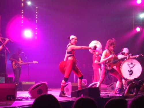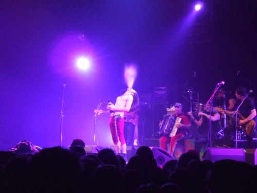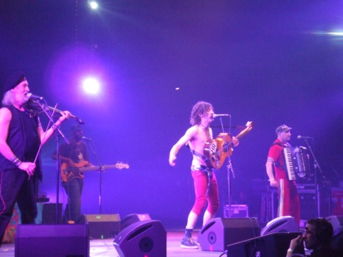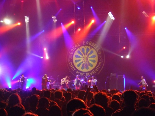 A l'intérieur, on retrouve devant une salle qui sonne encore un peu creux au niveau des gradins, les débraillés et bruyants Gogol Bordello qui avaient déjà crânement ouvert les Eurockéennes en 2007. On constate qu'Eugène Hutz n'est vraisemblablement pas allé chez le coiffeur depuis, mais qu'il a bien amené sa bouteille de pinard comme d'habitude. Il ne trouve d'ailleurs rien de plus fin à un moment que de cracher à la verticale au dessus de lui un joli nuage de vinasse qui viendra donc abreuver les animaux qui habitent probablement sa tignasse. Blague à part, le groupe est composé de très bons musiciens, leurs chansons un peu répétitives en disque font merveille pour chauffer n'importe quel public : Start wearing Purple par exemple. On verra avec plaisir une bonne moitié de leur concert, toujours joyeux et festif, de gypsy punk qui n'est pas sans rappeler la Mano ou Ska'P.