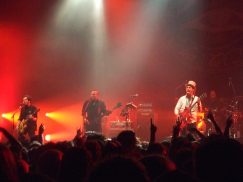 Il faut reconnaître qu'ils déploient une énergie sympathique, jouant juste mais chantant aussi approximativement que prévu leurs titres frais et pourtant légèrement agaçants : Comme en 68, Le Gang, Perdus cette nuit etc. dont le point commun est de piller systématiquement des riffs entendus mille fois comme si de rien n'était. Très joli en tout cas, cette horde de petits animaux sauteurs devant la scène... une petite soif entraînera toutefois un repli stratégique. Retour quelques minutes plus tard, tout en haut de la salle pour tester l'acoustique (excellente donc) - à ce moment-là le groupe joue au ralenti, l'air de rien, un riff piqué à Queens of the Stone Age (No One knows, pour celles que ça intéresse).