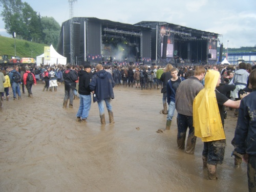 L'entrée du site a déjà été amplement décrite dans la première partie de cette chronique : ce matin elle a la même gueule de chiottes en plein air pour dinosaures dysenteriques, mais avec 10 cm de profondeur en plus : pour le dire simplement, ce n'est plus qu'un grand marécage de chiasse... comme tout le site d'ailleurs ! Autant dire qu'on va passer la journée dans la terreur de s'étaler dedans (parce que oui, bien sûr, ça glisse à mort !). On commence par avaler un délicieux Schnitzelbrot (il faut laisser ça à l'organisation : on mange bien, sur ce site !), tout en écoutant distraitement les dernières notes d'As I Lay Dying, dont on a rien retenu de particulier.