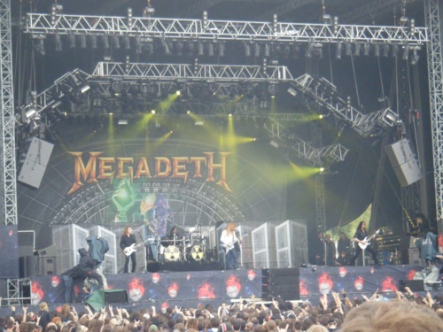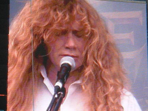 Retour à du lourd, car on a encore trois légendes du thrash à passer cet après-midi : voici venir le mythique Dave Mustaine, sa chemise blanche, son épaisse chevelure de blond vénitien et son petit projet solo à 15 millions d'albums, Megadeth ! Dans le soleil revenu, il y a du monde qui patauge gaiement - de là où nous sommes placés, pas moyen de voir nos pieds, on est comme collés par terre ! Avec le soleil revenu, le blob marron est en effet en train de se solidifier et la succion sur les pieds augmente encore. Je songe soudain qu'il y aurait un super slasher movie à tourner ici : L'Attaque de la Boue Anthropophage. Avec des filles hurlantes aux mollets déchiquetés, et des metalleux incrédules aux membres arrachés, regardant leurs moignons sanglants, une BO d'Anthrax bien sûr... Mais je m'égare : back to Dave !