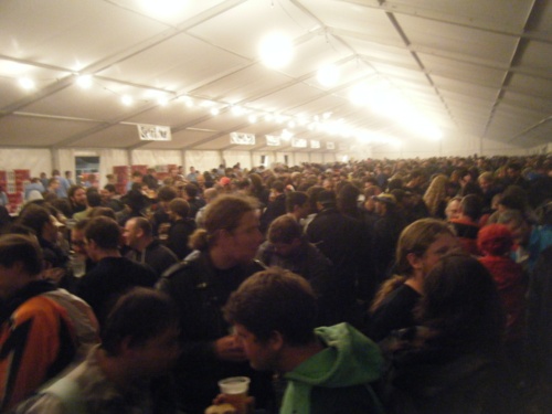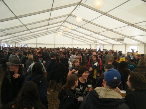 Ces tentes à ravitaillement sont le point fort du festival (à défaut d'un fléchage, d'un accueil, de voies de circulation hors boue, de plan distribué à l'entrée, et toutes cette sorte de choses petit-bourgeoises...) : 100 mètres de linéaire de comptoir, et autant de serveuses et serveurs, délivrant des hectolitres de bière, des dizaines de mètres carrés de pizza, des centaines de mètres linéaires de délicieuses "wurst" à agrémenter d'Estragon Senf délivrée par des machines en forme de pis de vache, etc, etc... On a beau être 50 000 (voire plus), il n'y aura jamais plus de cinq minutes d'attente. Et de manipuler cette monnaie exotique (des francs !), le dépaysement est double. C'est aussi devant une petite buvette ailleurs, que le record de profondeur de boue semble avoir été atteint (à vue de genou, entre 30 et 40 cm). Enfin il paraît que c'est bon pour la peau, alors...