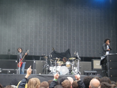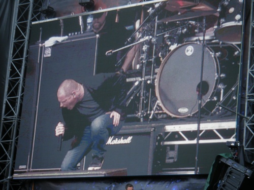 La question de savoir si on pourra sortir et revenir dans la fosse est vite évacuée : ça va pas être possible. De toutes façons les concerts de la scène voisine (Saturn) sont retransmis sur les écrans géants et avec le même volume sonore, et on voit pas si mal la scène d'ici. On suivra donc plusieurs concerts comme ça, à commencer par Bullet for My Valentine, jamais entendu, thrash metal assez conventionnel joué par la génération suivante, Flying V pour tout le monde (on ne verra d'ailleurs pas beaucoup de concerts sans cette guitare de toute la journée... un vrai doudou pour metalleux, on dirait).