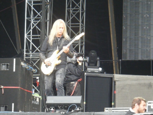 Il est vrai que la Flying V de l'ex-Metallica, affreusement décorée par ailleurs (comme toute la scène), a un son vraiment très au dessus du lot de ses copines. Par contre sauf erreur, on aura pas Angry Again, autre riff mythique qu'on espérait très fort... Au rappel, le gratteux d'Anthrax passe chanter quelques choeurs, en copain (seul crossover de la journée, et c'est bien dommage), et le concert se termine sur un instrumental virtuose et plaisant : une heure qui est passée dans un souffle, au fil d'un concert vraiment très prenant. Dommage que le frontman ne soit pas plus sympathique ni plus collectif (parler de "my new album", à 4 sur scène, quelle vulgarité, Sir !) ...