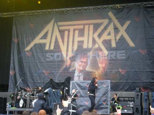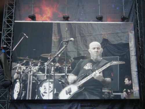 Groupe qu'on ne connaît que par best-of (dont pas mal de titres vont être joués), composé notamment d'un guitariste chauve au magnifique bouc gris, Scott Ian, et d'un chanteur sympathique et souriant, surmonté d'une chevelure manifestement teinte en noir - c'est que les pépères doivent être à peu près quinquagénaires ! A l'instar du titre Madhouse, ou de Caught in a Mosh, le groupe joue un heavy metal de bon aloi, old school et par moments percutants, avec chant miaulé traditionnel. On est néanmoins pas passionnés, quoique la reprise de l'Antisocial de Trust est un vrai bonheur régressif !