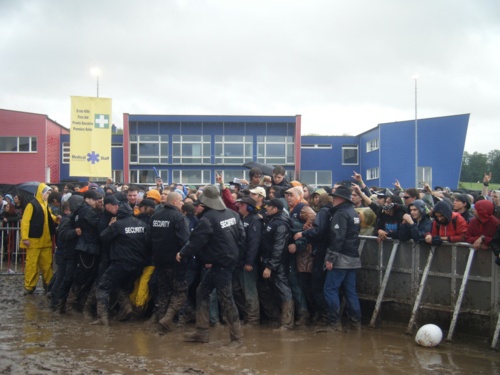 Accéder à la fosse est tout un poème : il y a des barrières pour canaliser les gens, et des videurs qui laissent entrer au compte-gouttes au seul passage ouvert. Curieuse méthode qui entraîne des bousculades et des malaises, quand il paraîtrait tellement plus simple de compter un nombre de spectateurs maximal, et fermer ensuite. On a en tout cas réussi à passer entre les mailles du filet (et à se réchauffer - rien ne vaut la bonne chaleur humaine d'autres humains trempés) avant que ça se transforme en mêlée ouverte (notre photo), sécurité contre metalleux, pack contre pack... Pile au moment où démarre le concert du premier des Big Four de la journée sur la grande scène (Apollo) : Anthrax !