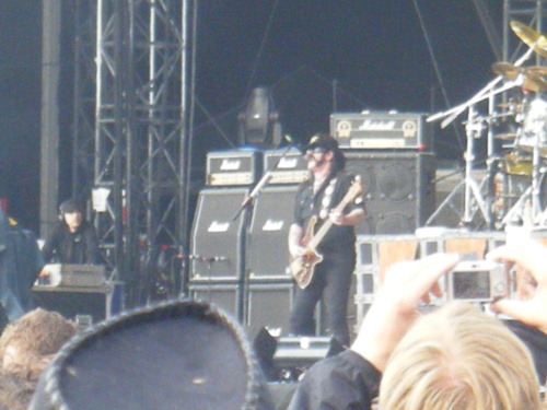 On s'éclipse donc un moment pour refaire nos niveaux à la tente magique. Pas assez longtemps hélas, pour se dispenser du pénible et inévitable solo de batterie de 5 minutes (qui en paraissent 10) de Mickey Dee, puis un rock'n'roll vite oublié parlant de filles brésiliennes. Et puis le fameux titre à message politique de Lemmy, Just cause you got the power, une autre de ses petites marottes... Il s'en est donc fallu de peu qu'on ne s'ennuie un peu, quand il nous offre ce monument de la poésie anglaise du 20ième siècle : Killed by Death (Tué par la Mort...) Suivi de près par leur tube insubmersible d'il y a 26 ans, la toujours jouissive Ace of Spades, climax du concert !
