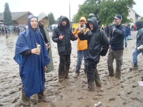 Comment commencer mieux une journée qu'en se réveillant frigorifié dans une tente humide et crade, sous une pluie persistante, tente parcourue d'odeurs corporelles diverses... mais en compagnie de bons camarades et pour aller voir peut-être, la plus grande affiche Metal de tous les temps ? L'un d'entre nous semble avoir trouvé la réponse, qui décide de jeter l'éponge dès ce stade-là. Dommage pour lui ! Nous partîmes 8, nous arrivâmes 7... Après moult hésitations à sortir du duvet, et un bon quart d'heure de manoeuvres les mains dans le caca, on a réussi à remettre ses chaussures (crottées tout autour d'un bon centimètre de boue), son pantalon de festival (déjà marron merde jusqu'aux genoux), et diverses autres affaires trempées de la veille. Brrr... On a l'impression d'avoir rattrapé d'un coup 10 ans d'Eurockéennes clémentes !